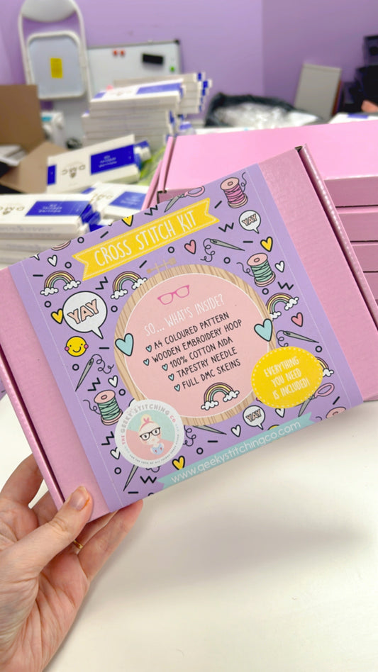 The Geeky Stitching Co was founded in 2014 by me, Jess (nice to meet you!) when I couldn't find any cute patterns to stitch up so I decided to design my own. Over a decade later we have sent out tens of thousands of kits across the globe to lots of amazing customers! Every single one of our patterns is hand drawn & all our kits are manufactured by our tiny team in Devon.